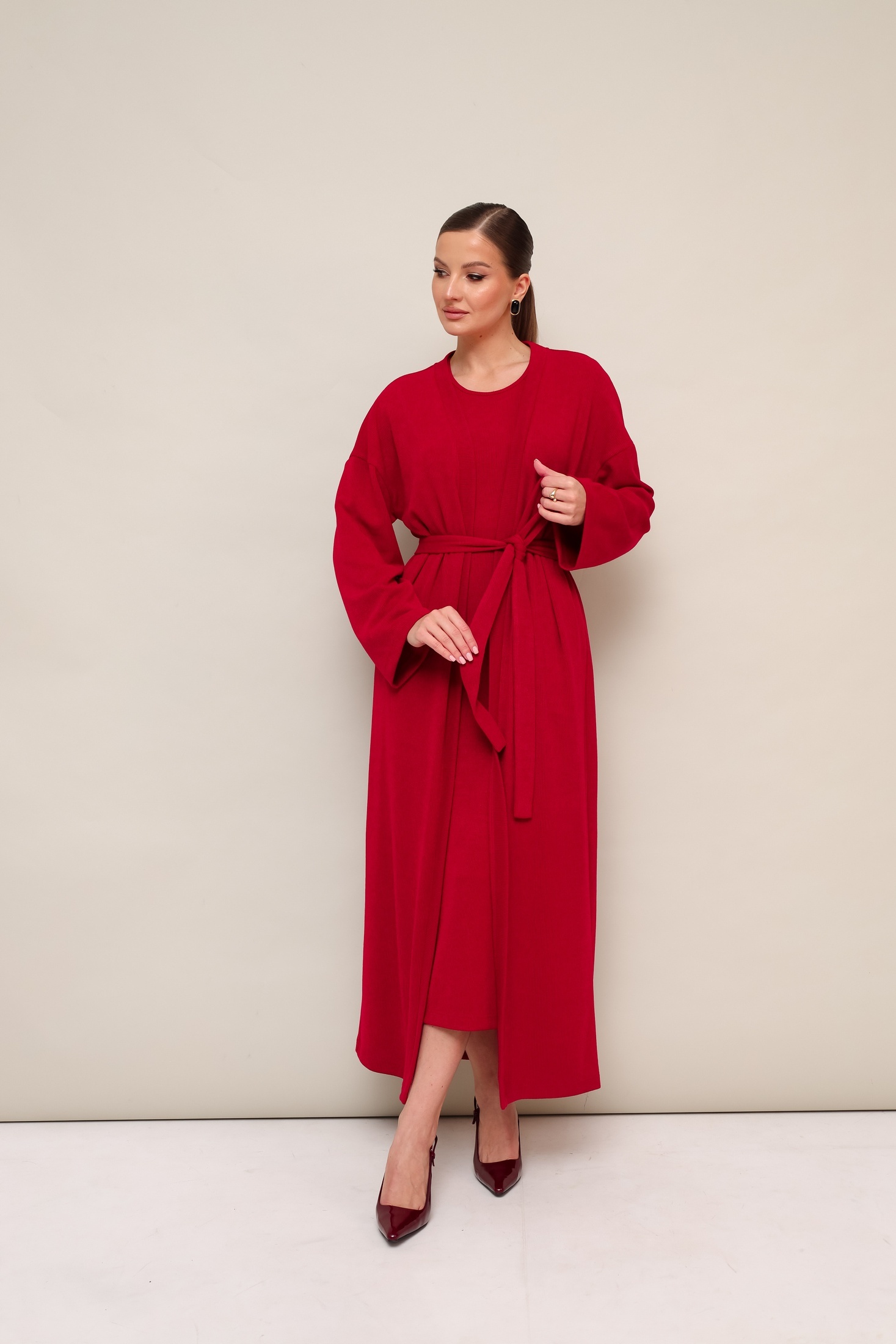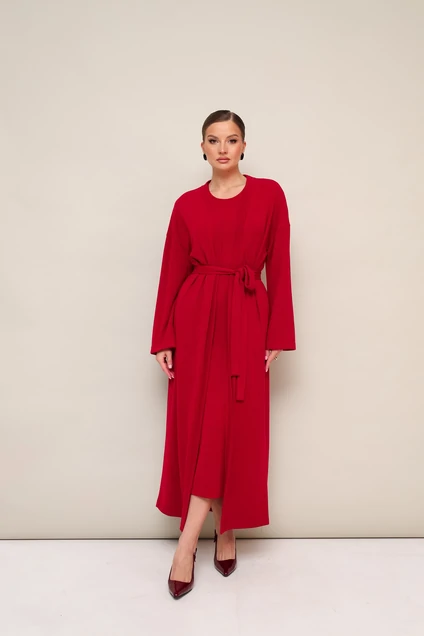 Костюм с платьем 11-324-2 Pur Pur — это идеальный выбор для стильных прогулок и повседневного использования. Коллекция бренда Pur Pur предлагает комплект из мягкого трикотажа, включающий кардиган и платье. Платье миди длины с округлым вырезом горловины и рукавами до локтя, дополнено поясом из основной ткани для акцента на талии. В левом боковом шве предусмотрен высокое разрез, что добавляет элегантности и свободы движений. В кардигане предусмотрены внутренние карманы, что делает его практичным и удобным. Этот наряд отлично подходит для весны и осени благодаря своему теплому, но не перегревающему материалу. Яркий красный цвет в сочетании с минималистичным дизайном делают этот костюм универсальным решением для вашего гардероба.