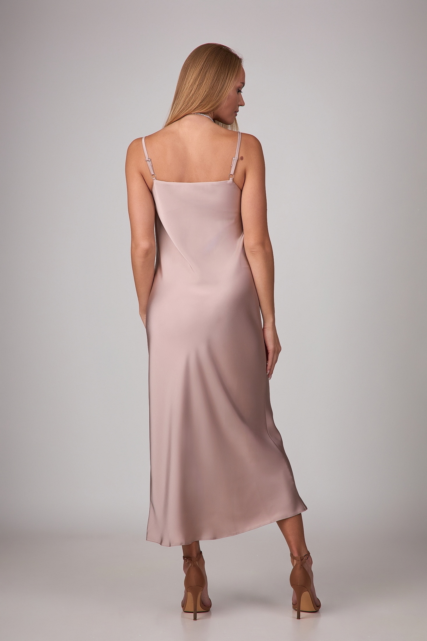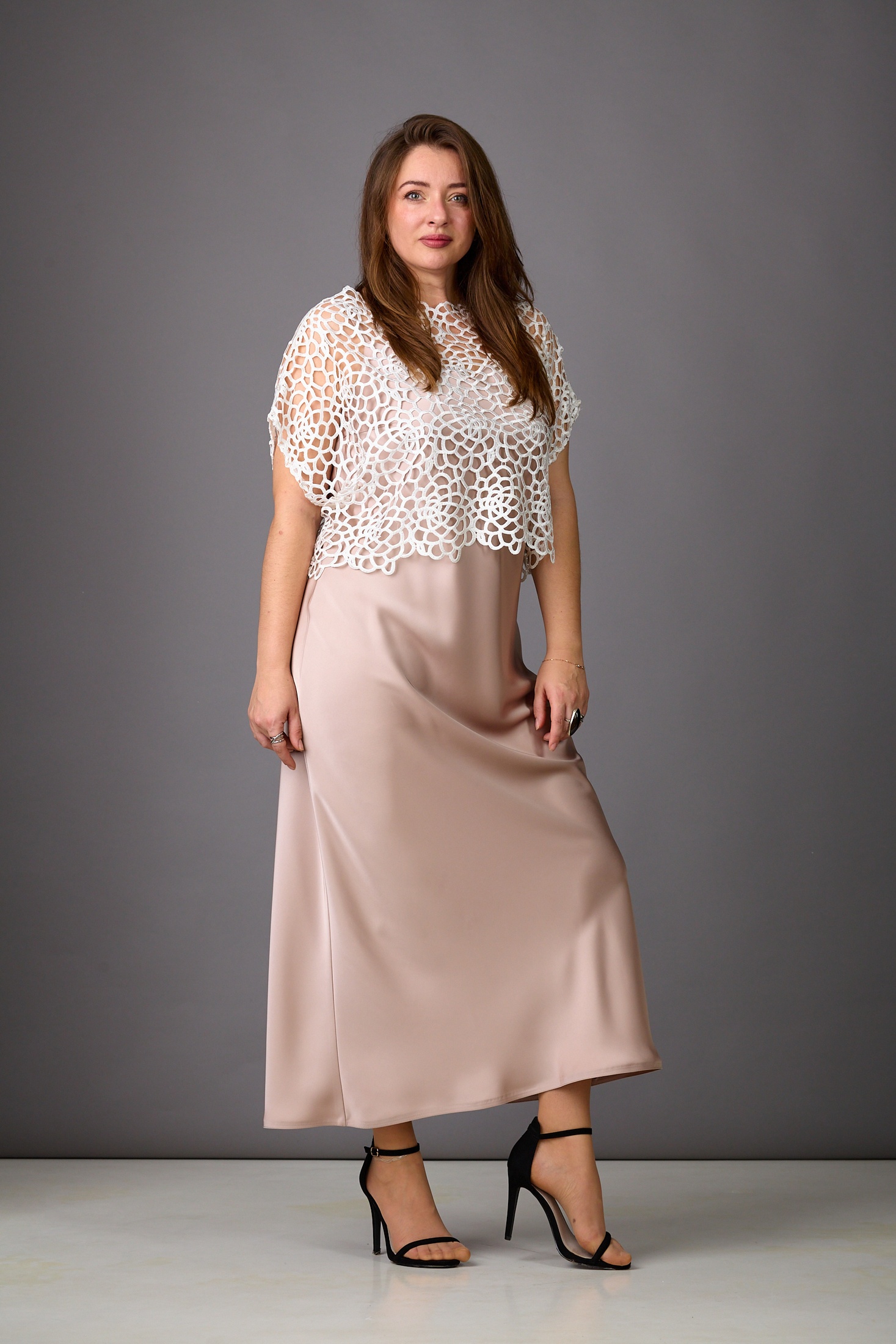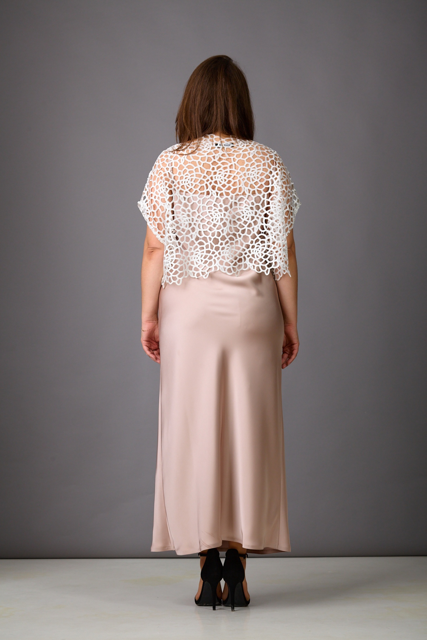 Элегантный женский костюм, состоящий из платья-комбинации и кружевной накидки, идеально подходит для торжественных мероприятий. Платье выполнено из высококачественного атласа-стрейч пастельного бежевого цвета, крой по косой обеспечивает идеальную посадку и подчеркивает силуэт. Платье дополнено регулируемыми бретелями, что позволяет подогнать его под любой тип фигуры. Без молнии для бесшовного вида. Особый шик добавляет накидка из белого кружева с роскошным цветочным узором, которая элегантно дополняет образ. Накидка с расширенной линией плеча добавляет изящества и воздушности. Этот комплект идеально подойдет для создания неповторимого и стильного образа на любое значимое событие.