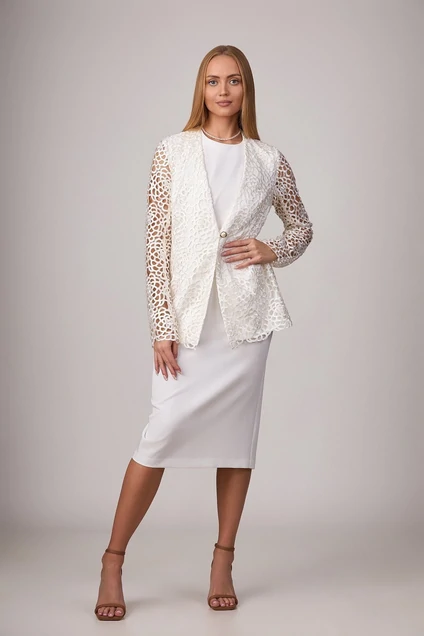 Комплект из костюмной ткани на подкладке, состоящий из жакета и платья. Роскошный жакет, выполненный из кружева и плательной ткани. Жакет прямого силуэта, с нагрудными вытачками, застегивающийся на навесную петлю и пуговицу. Рукава - длинные. Платье слегка приталенного силуэта без рукавов. Горловина и проймы обработаны обтачкой. Молния в среднем шве спинки. Шлица обеспечит свободу движения.