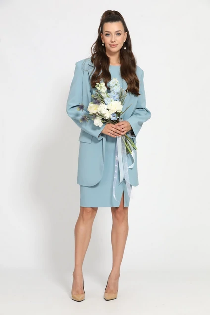 Комплект женский полуприлегающего силуэта ,вточного покроя ,выполнен из костюмно-плательной ткани.Жакет удлинен ,выполнен на подкладке ,застежка центрально-бортовая на одну петлю-пуговицу .На спинке расположен вертикальный шов. Нарядное платье слегка зауженное к низу.На пережде в левой части расположен подрез идущий из бокового шва переходящий в разрез .Ремень не входит в комплект.