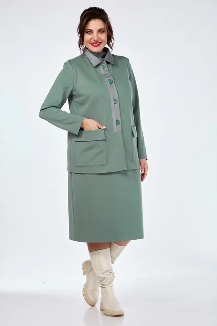 Костюм женский двухпредметный, состоящий из платья и жилета из трикотажного полотна с отделкой из плащёвки. Жилет женский полуприлегающего силуэта длиной до бёдер с центральной декоративной застёжкой с подрезом на 4 петли-пуговицы. По переду обработаны нагрудные вытачки, идущие из бокового шва и накладные карманы, имитирующие клапан. Спинка со средним швом. Воротник отложной. Жилет на подкладке. Платье женское, слегка зауженное к низу, полуприлегающего силуэта, длиной до колена с цельнокроенным воротником-стойкой. По деталям переда обработаны нагрудные вытачки. Спинка со средним швом, заканчивающимся шлицей. Рукава втачные, длиные, одношовные. Длина платья по спинке - 117 см. Длина жилета по спинке - 69 см. Длина рукава платья - 61 см.