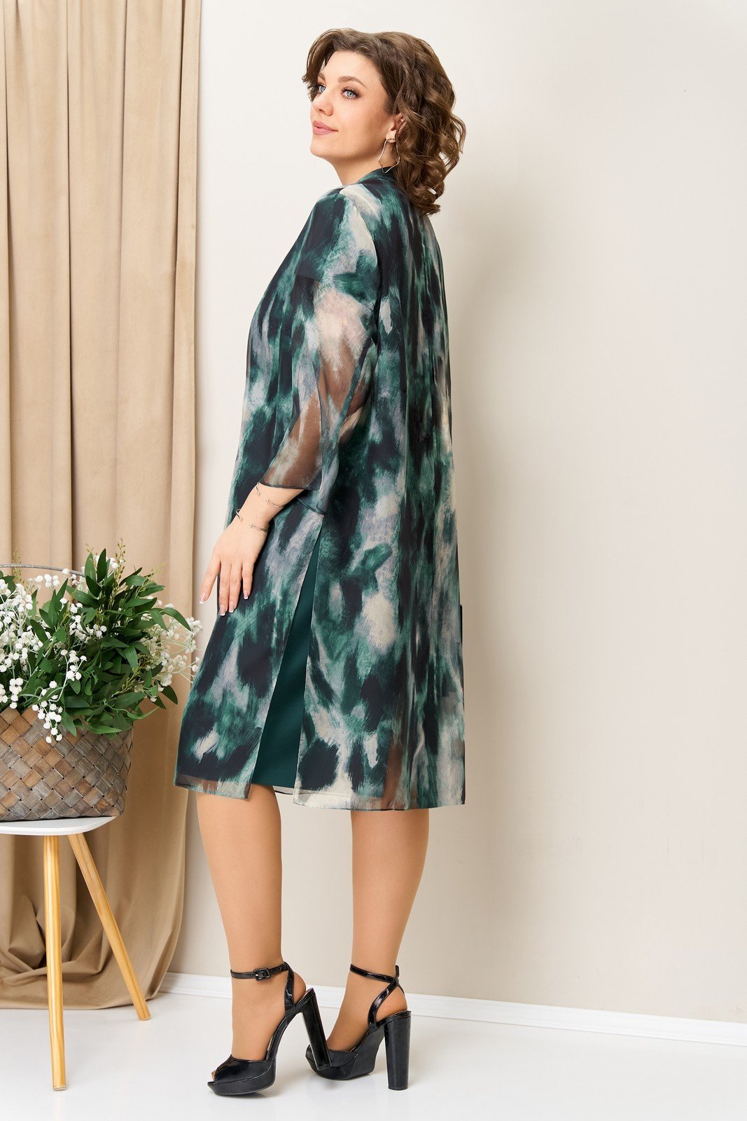 Элегантный женский костюм, состоящий из нарядного платья и удлиненной накидки. Платье выполнено в спокойном темно-зеленом оттенке, имеет полуприлегающий силуэт, который эффектно подчеркивает фигуру, и оснащено опущенным коротким рукавом. Длина платья составляет 102 см по центру спинки. Накидка из легкого шифона украшена стильным абстрактным принтом в зелено-серых тонах, создающим изысканный и модный образ. Модель с цельнокроеными рукавами и глубокими разрезами по бокам добавляет изделию легкости и непринужденности. Длина накидки составляет 104 см, что идеально сочетается с длиной платья, создавая гармоничный и завершенный образ. Такой костюм идеален для торжественных мероприятий и вечерних выходов, подчеркивая изысканность и утонченный вкус его обладательницы.