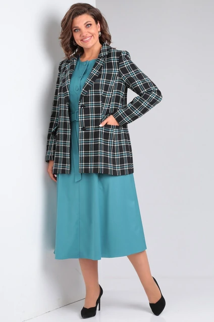 Комплект женский, состоящий из жакета и платья. Жакет однобортный на подкладке. Воротник отложной с лацканами. Спереди расположены карманы с клапаном. Рукав втачной, двухшовный. Длина рукава для роста 164 см 60 см, для роста 170 см 62 см. Длина изделия от плеча по спинке для роста 164 см 71 см, для роста 170 см 73 см. Платье женское приталенное, расклешенное к низу. Горловина округлая. Застегивается на пуговицы. На нижней части платья расположены карманы «листочка». Рукав втачной. Длина рукава для роста 164 см 60 см, для роста 170 см 62 см. Длина изделия от плеча по спинке для роста 164 см 117 см, для роста 120 см 73 см. Пояс из основной ткани.