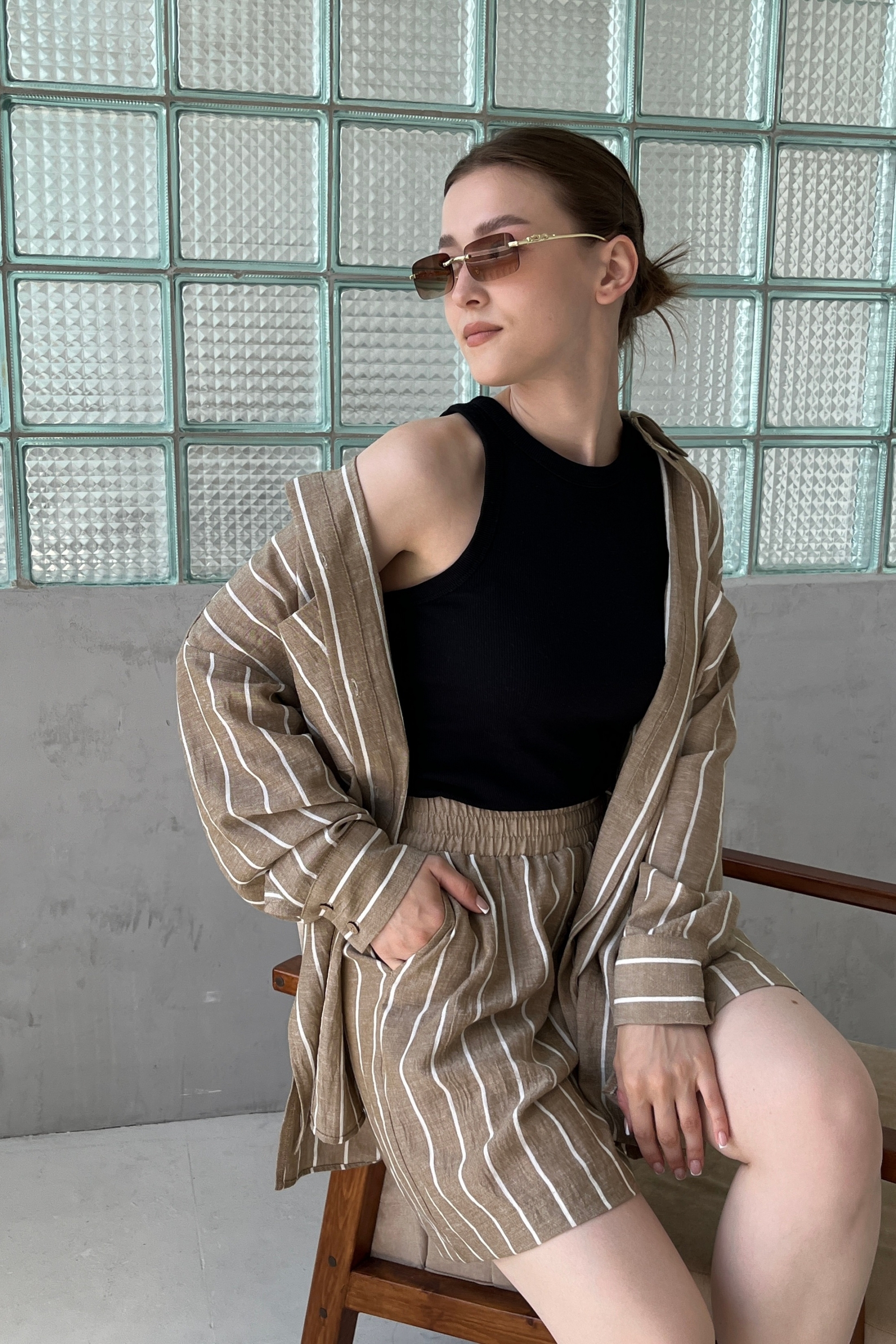 Комплект женский двупредметный из лёгкой плательно-блузочной смесовой ткани в полоску с креш-эффектом, состоящий из блузки и шорт. Блузка рубашечного кроя-over, длиной ниже линии бёдер, со спущенной линией плеча и длинным рукавом. Рукав на притачном манжете с застёжкой на петли-пуговицы. Перед с центральной застёжкой на кокосовые пуговицы, с нагрудными карманами и цельнокроенными планками. Спинка с двойной кокеткой, цельнокроенной с кокеткой переда. В шве кокетки спинки имеется складка. В боковых швах длинные разрезы от талии. Низ прямой. Шорты свободного кроя, длиной выше колена, на притачном широком поясе с резинкой и отстрочкой по ней, с боковыми функциональными карманами с отрезным бочком ("карманы-хулиганы"), с иммитацией застёжки спереди и декоративными кокосовыми пуговицами по ней. Размер 42 84-66-92 Размер 44 88-70-96 Размер 46 92-74-100 Размер 48 96-78-104