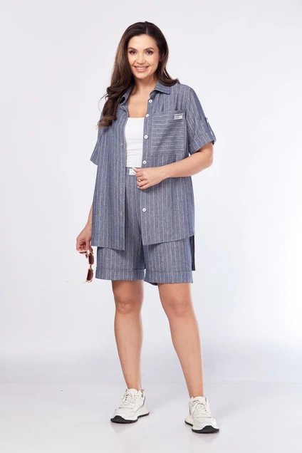 Женский двухпредметный костюм состоит из рубашки и шортов выполненых из плательно-костюмной ткани в полоску.