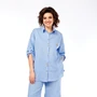 Комплект женский состоит из рубашки и шорт. Рубашка свободного кроя с центральной застежкой на птели и пуговицы по переду, и спинке кокетке. По спинке заложена вытачная складка. По переду накладные карманы. Плечо спущенное, рукав втачной одношовный. ДЛина рукава регулируется с помощью хлястика. По боковым швам разрезы. Воротник стояче-отложной с отрезной стойкой. Шорты прямые, по переду карманы в боковых швах. По задней части кокетка и накладыне карманы. Верхний срез обработан поясом с резинкой, вставлены шлевки. По низу манжеты. В качестве отделки используется фурнитура. Длина по спинке 78 см, длина рукава 33 см. Длина шорт 62 см.