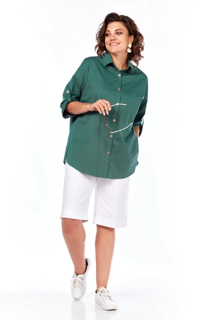 Комплект брючный состоит из блузы и шорт. Блуза прямого кроя с центральной застежкой на петли и пуговицы. Перед с плечевой кокеткой и одним накладным карманом по левой стороне. Спинка с плечевой кокеткой и застежкой от кокетки до низа на петли и пуговицы,нижняя планка с печатью "буквы", по боковым швам обработаны разрезы. Рукав длиной 3/4 со спущеной линией плеча. Длина регулируется хлястиком и пуговицей. Воротник рубашечный со стойкой. Шорты прямые, верхний срез обработан притачным поясом, застежка на тесьму-молнию. На задней половинке накладные карманы, в боковых швах карманы. В качестве отделки используется фурнитура и отделочная строчка . Длина блузы по спинке 74 см, длина рукава 32 см. Длина шорт 61 см.