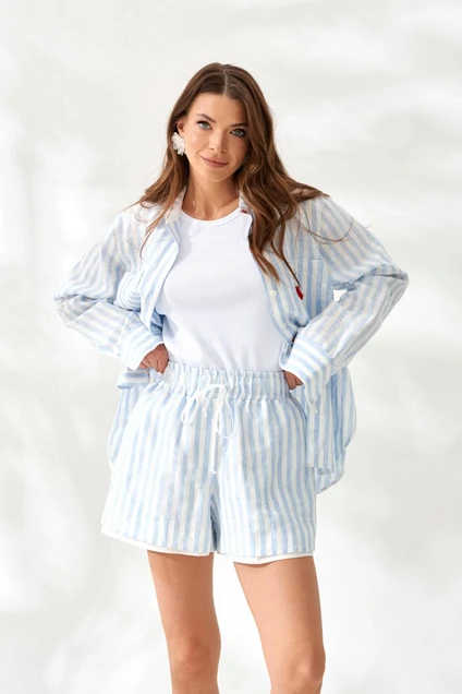 Комплект женский 2х предметный из льна в полоску,состоящий из блузки-рубашки и шорт. Блузка-рубашка прямая свободная с центральной застежкой на петли и пуговицы длиной ниже линии бедер. По полочкам нагрудные вытачки, в верхней части симметричные накладые карманы, на левом кармане вышивка "вишни". В рубашке двойная совмещенная со спинкой кокетка, разрезы в боковых швах, переходящие в полукруглый низ. Спинка цельная с бантовой складкой по центру. Рукав одношовный с разрезом и притачной манжетой, застегивающейся на одну красную и две молочных пуговицы. Воротник рубашечный отложной на притачной стойке(стойки и нижний воротник из однотонной ткани).Пуговица на стойке и верхняя на планке- красные. Шорты короткие на широком притачном поясе с резинкой и шнуром из окантовки, на подкладке из молочного хлопка,которая видна снизу шорт.По бокоым швам внизу полукруглые разрезы. По переду карманы у боковых швов с отрезным бочком.