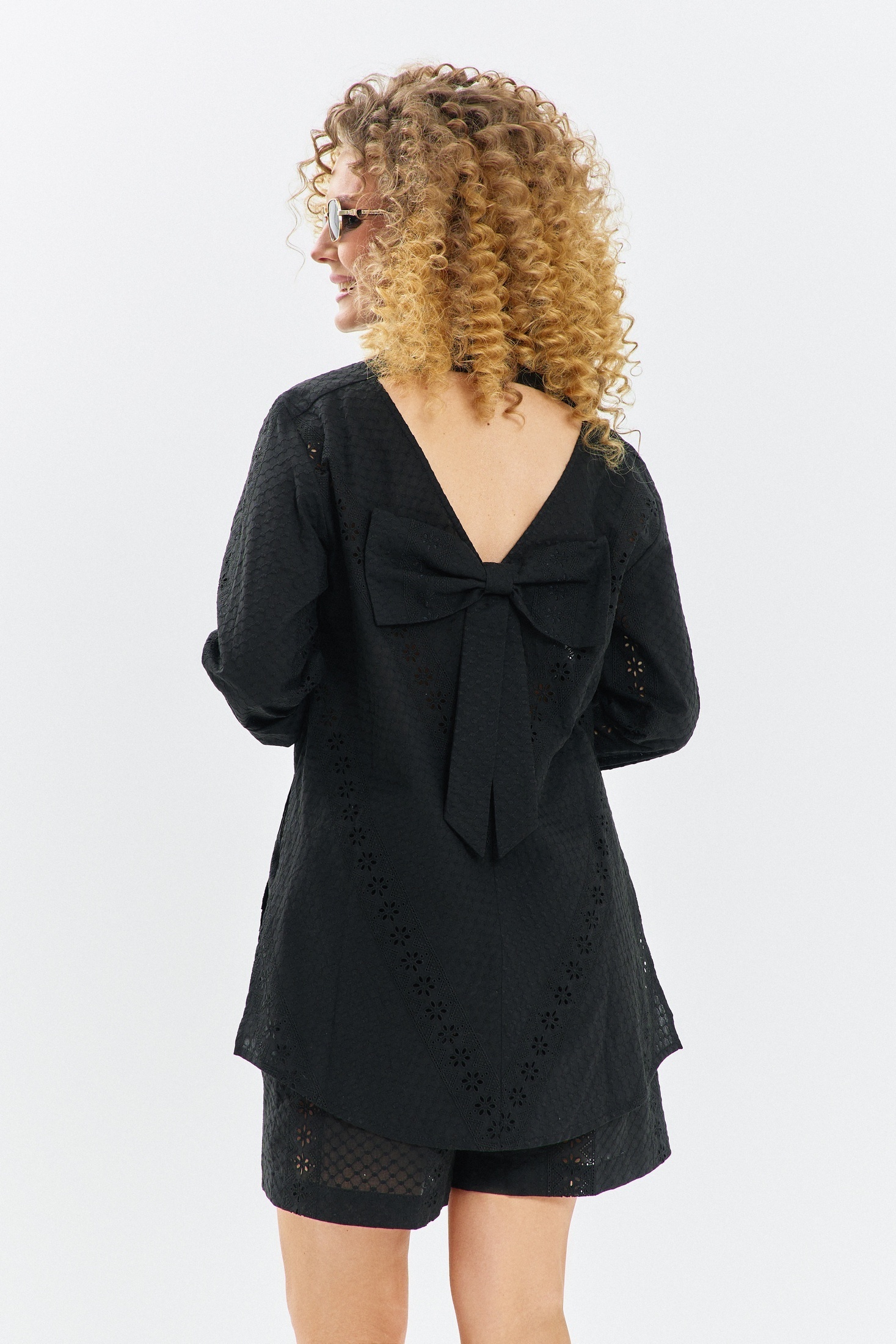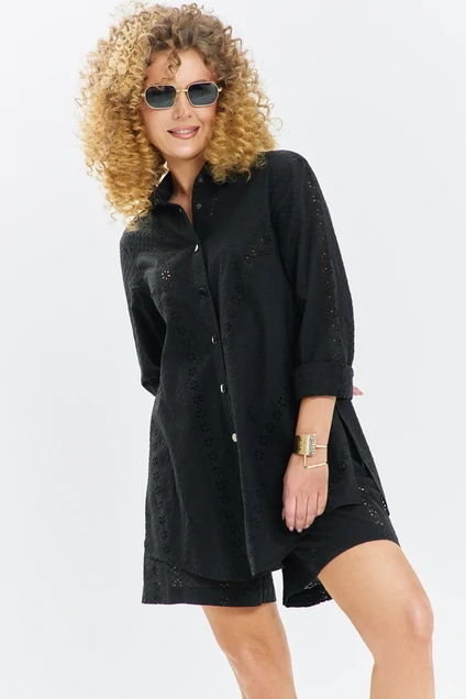 Костюм женский, состоит из рубашки и шорт, выполнен из хлопка с вышивкой ришелье. Рубашка свободного кроя, по полочке изделия расположены накладные карманы. Рукав изделия длинный. Горловина отложной воротник на стойке. По спинке изделия расположена кокетка и декоративный вырез с бантом. Застежка петли-пуговицы на планке. Шорты прямого кроя с небольшим подворотом по низу. Изделие на притачном поясе с резинкой. В боковых швах расположены карманы. Застежка молния на гульфике и петля-пуговица. Универсальный черный цвет в сочетании с ажурной вышивкой позволяет носить костюм как в городе, так и на отдыхе. Это готовый вечерний образ для прогулки по набережной или похода в кафе.