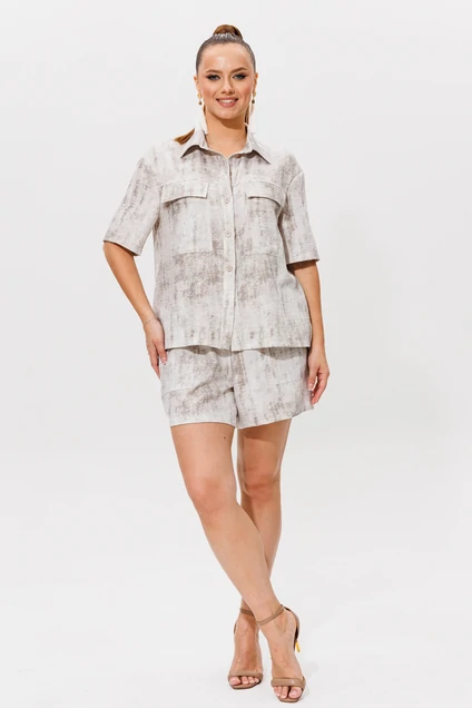 Яркий и  стильный комплект включает удобные шорты и свободную рубашку,что делает его универсальным выбором для повседневной носки или отдыха. Костюм выполнен из струящейся лёгкой ткани с добавлением вискозы.Рубашка прямого силуэта с воротником стойкой и застёжкой на петли и пуговицы.По переду имеются накладные карманы.В боковых швах имеются разрезы. Шорты свободного кроя,длиной выше колена широкой резинкой и шнурком.На шортах имеются накладные карманы.