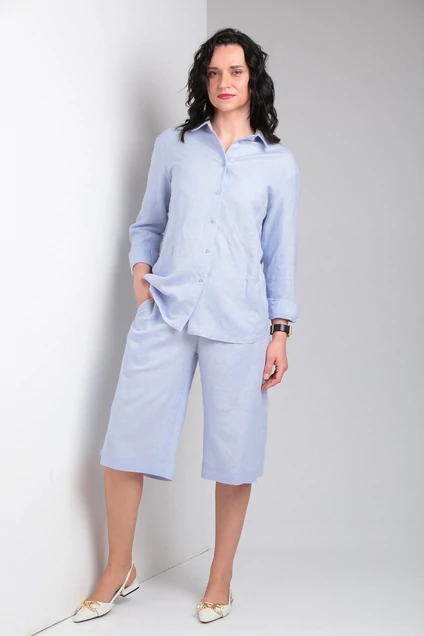 Рубашка свободного силуэта с длинным рукавом. По переду застежка на петли-пуговицы. В верхней части спинки кокетка. Воротник со стойкой, по низу рукава отрезная манжета. Длина от шва притачивания воротника до линии низа 77 см., длина рукава 62см.. Бермуды прямого силуэта с боковыми карманами, застежкой -гульфиком и отрезной кокеткой по линии талии шириной 9 см.. Длина от верхнего края кокетки до низа 69 см.. Длина бермудов от верхнего края пояса 68см..