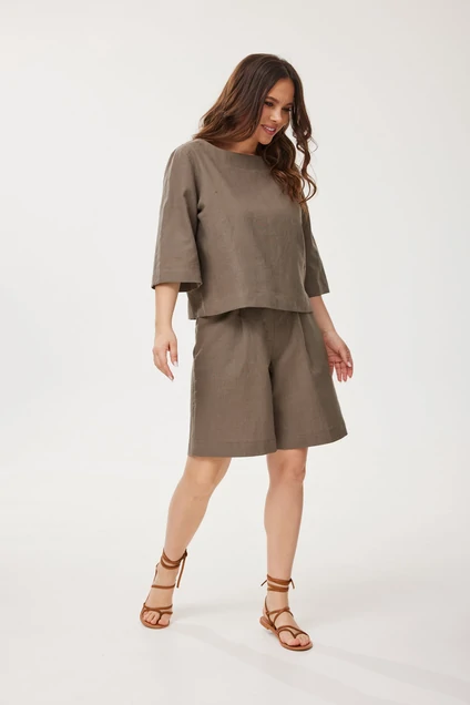Комплект 2-ух предметный состоит из Блузки м 1245 и Шорт м 687 . Блузка укороченная свободного силуэта с втачным рукавом 3\4 из качественного мягкого льна с эффектом мятости . Классический вырез лодочка.