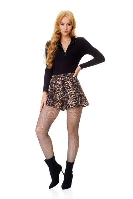 Супер молодежный комплект состоит из леопардовых шортиков и трикотажного джемпера-водолазки.