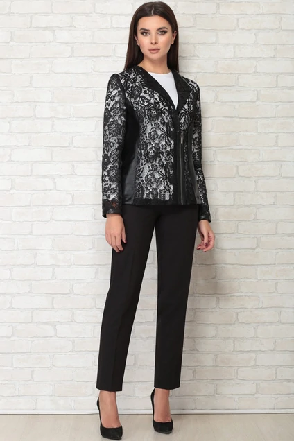 Куртка женская полуприлегающего силуэта, без подкладки, без плечевых накладок, с бортовой застежкой на разъемную тесьму-«молнию» длина 30 см. . Куртка выполнена из эко кожи и ажурного кружева. Бочки и спинка куртки - ткань эко кожа, по переду вставки ажурное кружево. Рукава втачные, одношовные, низ рукава эко кожа, верх рукава кружево. Длина по центру спинки 61 см. Длина рукава 60 см.
