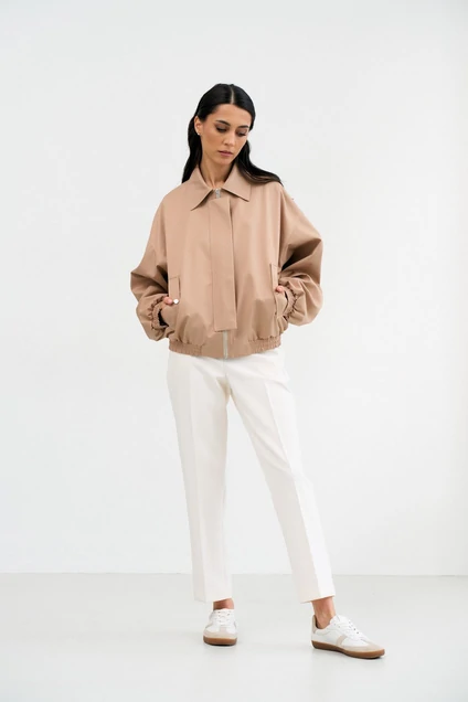 Куртка свободного кроя, по низу на резинке. Имеет два накладных кармана, воротник-стойку и застежку на молнию и кнопки металлик.