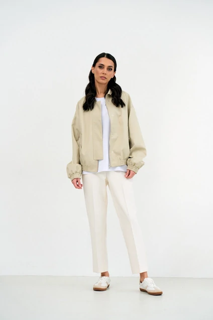Куртка свободного кроя, по низу на резинке. Имеет два накладных кармана, воротник-стойку и застежку на молнию и кнопки металлик.