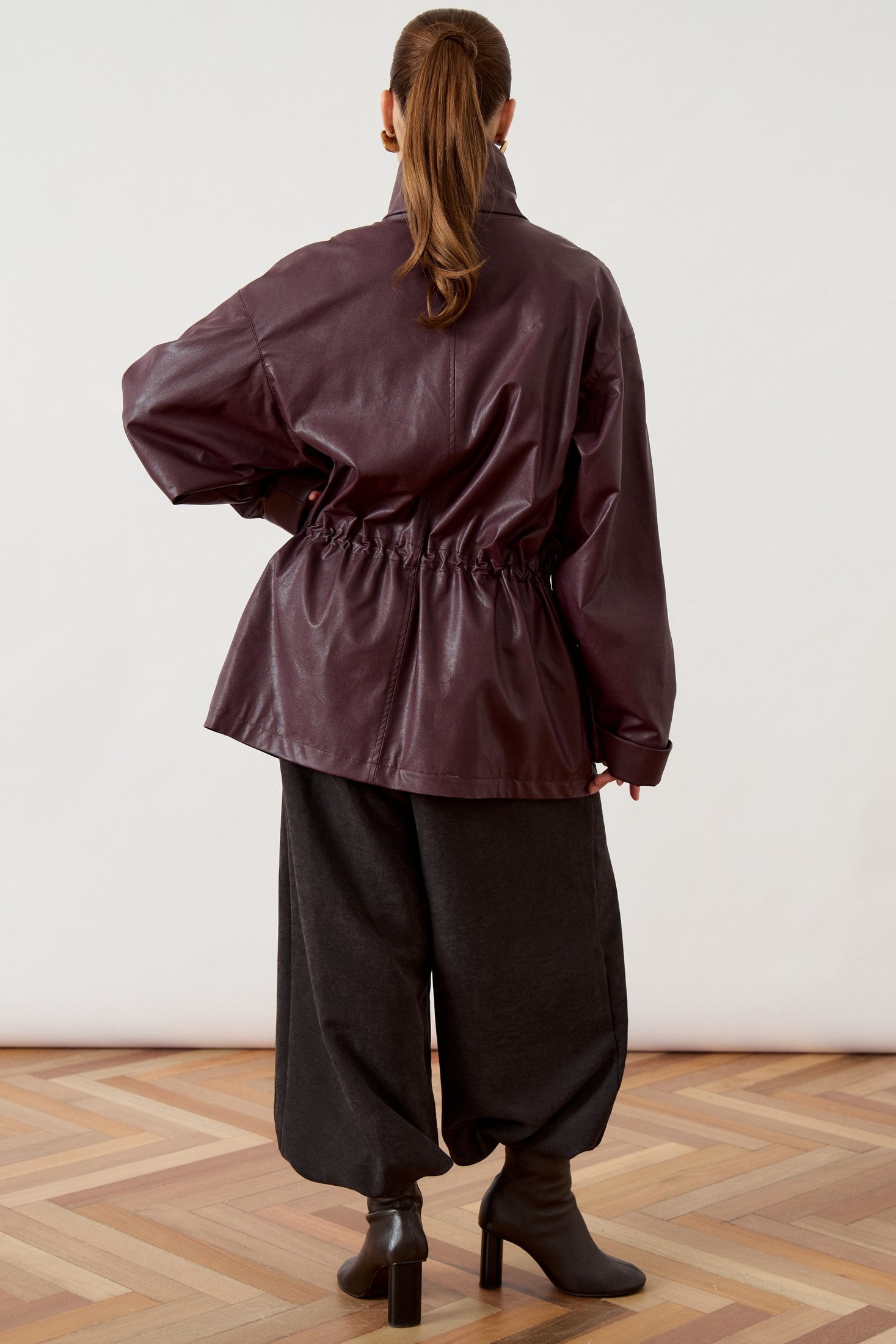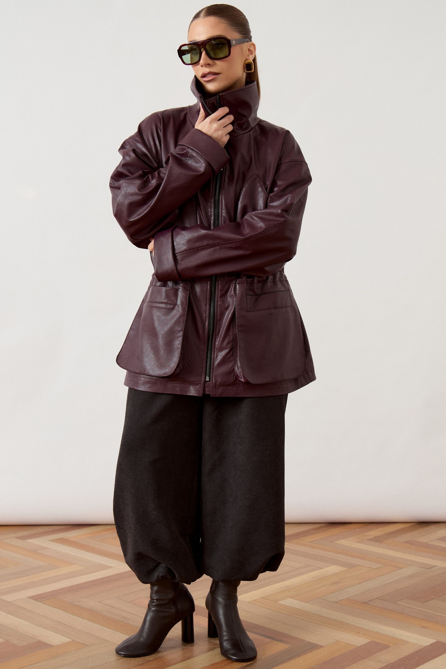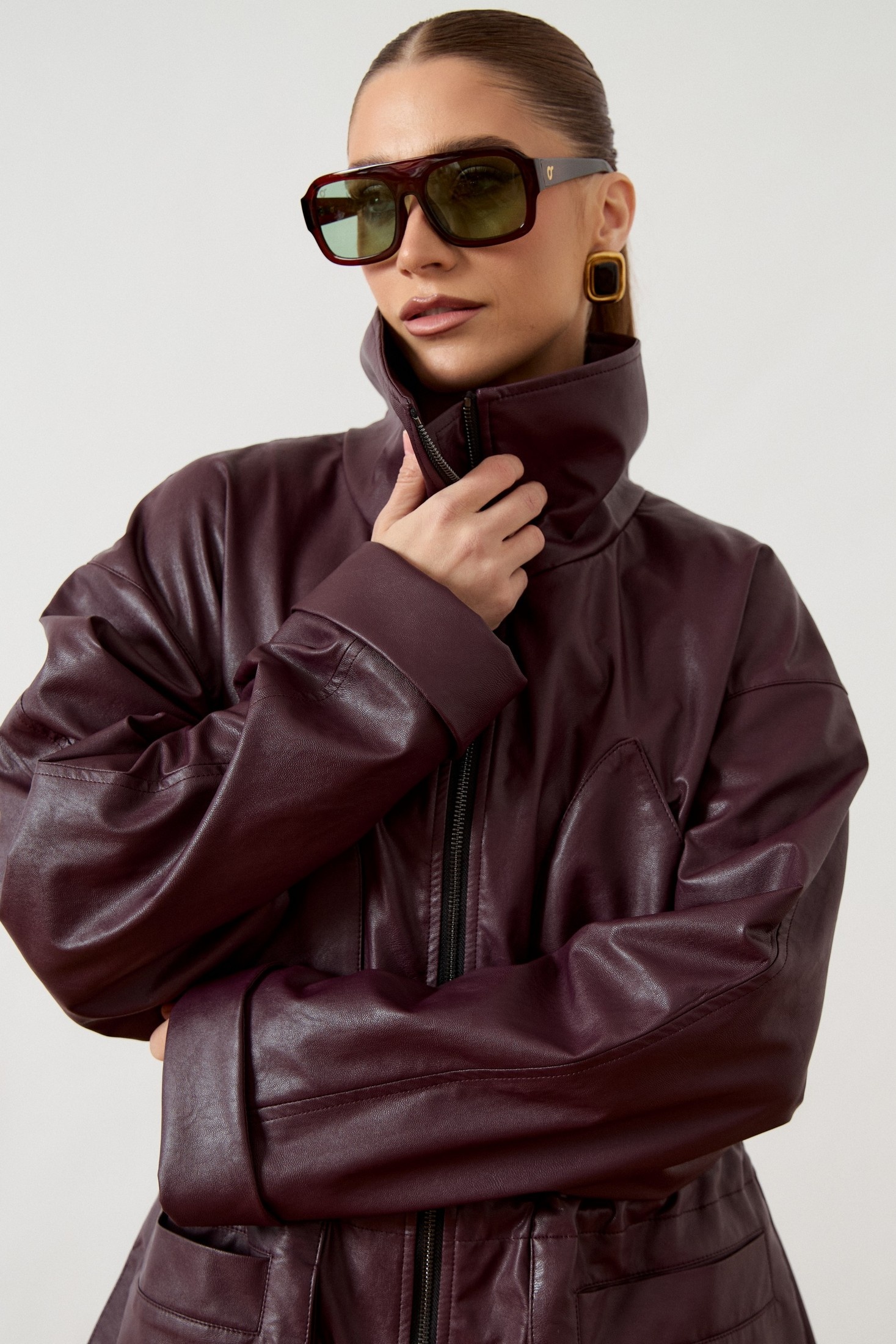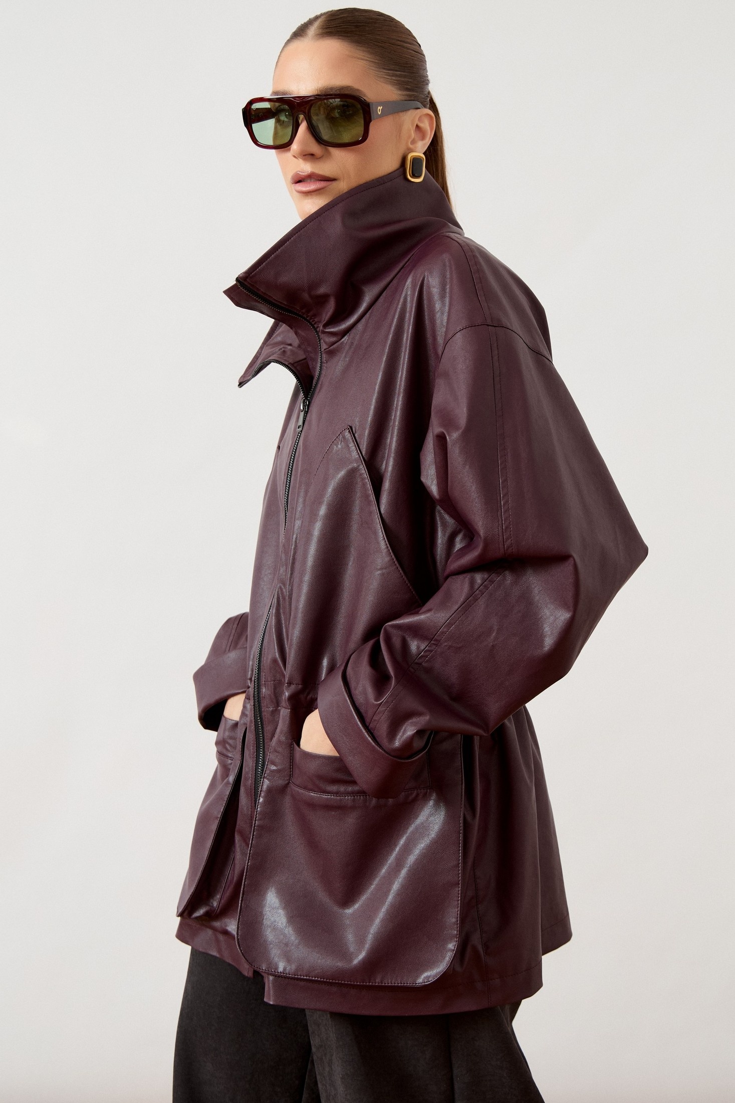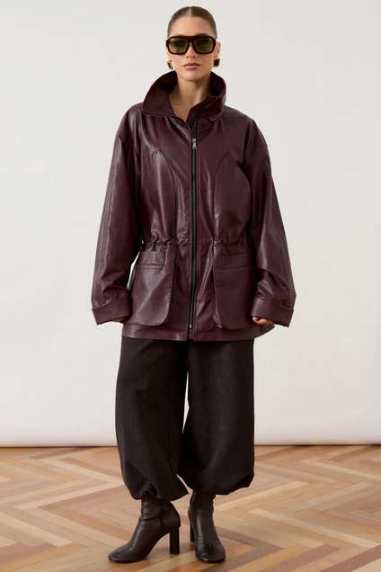 Куртка 3478 ATTIKA прекрасно сочетает стиль и комфорт. Коллекция бренда ATTIKA предлагает модель из мягкой экокожи, что обеспечивает износостойкость и лёгкость в уходе. Свободный прямой силуэт и спущенная линия плеча делают куртку подходящей для повседневного гардероба. Воротник-стойка и центральная застежка на молнию добавляют современный акцент. Кулиска на талии помогает регулировать посадку, подчеркивая фигуру. В нижней части расположены крупные накладные карманы с клапанами для практичности. Широкие рукава с манжетами добавляют стильный завершающий штрих. Куртка отлично подойдет для осеннего и весеннего периодов, а глубокий бордовый цвет добавит выразительности любому образу.