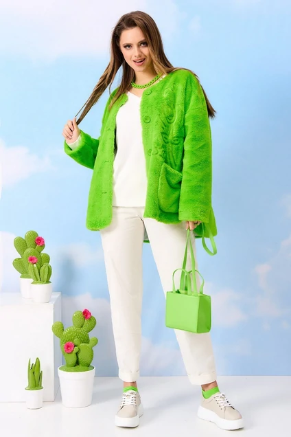 Трендовый жакет из легкого и шелковистого экомеха свободного силуэта, с расширенной спинкой, застежкой на пуговицы, круглой горловиной, с удобными накладными карманами. Изделие на подкладке из непродуваемого материала. Перед и спинка жакета декорированы оригинальной авторской вышивкой.