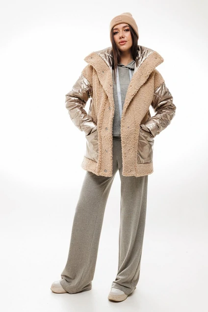 Куртка женская комбинированная из экомеха "тедди" и плащёвой ткани с фигурной стёжкой на утеплителе isosoft 200. Куртка прямого силуэта, со спущенным плечом и втачным одношовным рукавом. Воротник – стойка, высокий. Застежка центральная на притачных планках, застегивающихся на кнопки. По полочкам настрочены накладные карманы с клапаном из гладкой плащевой ткани.