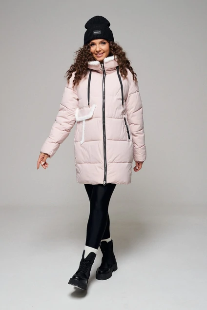 Капюшон притачной по линии горловины с декоративной отделкой по краю в виде искусственной меховой тесьмы.