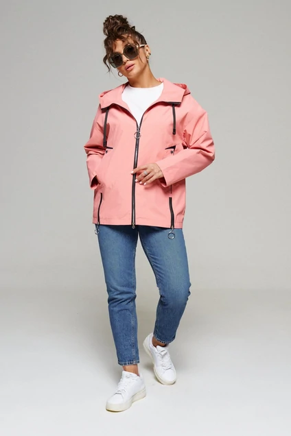 Лёгкая, удобная и уютная куртка подходит на все случаи жизни. Куртка выполнена из тонкой, но достаточно прочной и приятной на ощупь влагостойкой, полиэфирной ткани; на синтетической подкладке; прямого силуэта, базового кроя; предназначена для повседневного использования. Передняя часть изделия с декоративными рельефными подрезами, прорезными карманами с элементами из вставок в контрастном цвете ткани и двумя декоративными вставками в виде контрастных молний в нижней части переда. Застежка центральная на декоративную молнию, длиной от верхней части капюшона до нижнего края изделия. Спинка с двумя симметричными, вертикальными рельефами. Линия плеча спущена. Рукав длинный, одношовный, втачной. Капюшон притачной по линии горловины. По периметру капюшона протянута репсовая тесьма, с плоскими, декоративными наконечниками. Низ изделия ровный. Подкладка гладкая, имеет дополнительный внутренний карман.