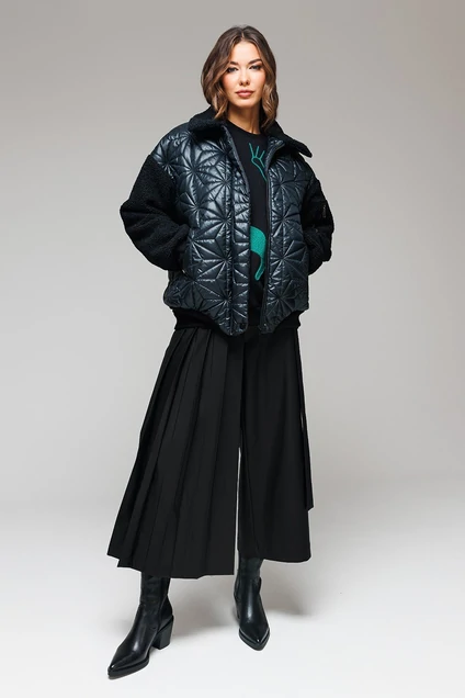 Куртка прямого силуэта со спущенным плечом с центральной застежкой на тесьму молнию и планкой с застежкой на 2 кнопки. На левом рукаве карман с застежкой на тесьму молнию. Воротник-стоячеотложной на отрезной стойке. Воротник и рукава выполнены из отделочной ткани. По переду карманы- листочки. По низу рукавов и низу куртки декоративная отделка из довяза. Куртка изготовлена из плащевой ткани с фигурной стёжкой на синтепоне и подкладке.