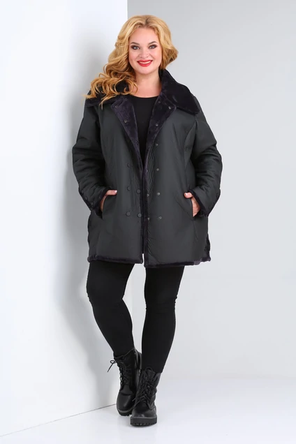 Полочка с рельефами, в которых расположены внутренние функциональные карманы. Застежка центральная двубортная на кнопки. Воротник двойной отложной. Спинка с центральным швом. Рукав втачной одношовный. В боковых швах куртки и на рукавах функциональные шлицы. Длина изделия по спинке 79 см. Длина рукава 64 см во всех размерах. Пальто без утеплителя и подкладки, изнанка - экомех. Выполнено из мягкой непромокаемой ткани. Все кнопки на изделии металлические. Примечание: Перед первой примеркой рекомендуется пройти изнанку (мех) изделия липким роликом для чистки одежды. Модель до 82 размера