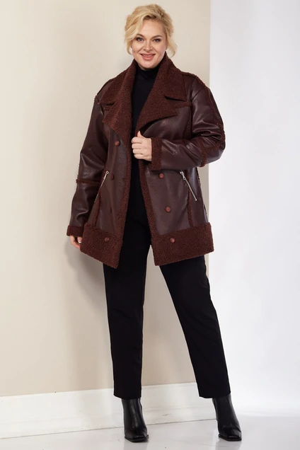 Полочка и спинка разрезные с кокеткой. Полочка с рельефами и внутренними функциональными карманами на молнии. Застежка центральная двубортная на петли и пуговицы. Воротник отложной. Рукав втачной разрезной со спущеным плечом. В модели есть прибавка на верхнюю одежду.