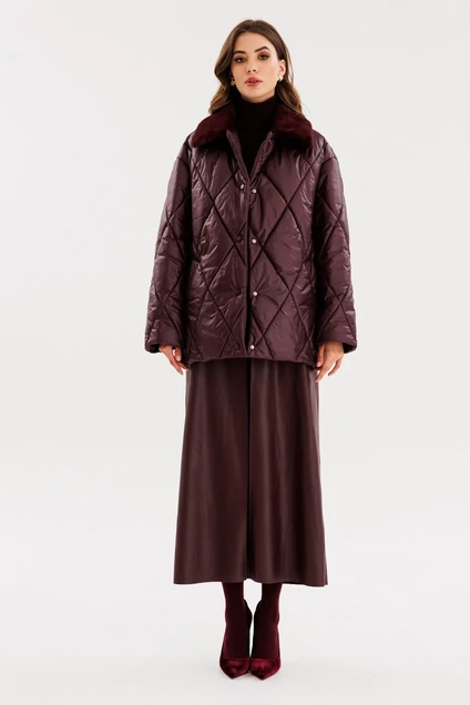 Куртка выполнена из плащевой ткани, стеганой с утеплителем Isosoft. Спереди прорезные карманы и застежка на кнопки. Спинка цельная. Плечевой шов удлинен. Воротник стояче-отложной из эко-меха в цвет основной ткани. Рукав рубашечного покроя, одношовный. Куртка на притачной по низу подкладке.
