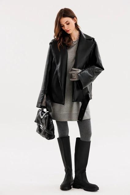 Куртка выполнена из эко-кожи. Куртка прямого силуэта, длиной до линии бедер. Спереди прорезные карманы, лацканы и смещенная застежка на молнию. Спинка цельная. Воротник пиджачного типа. Плечевой шов удлинен. Рукав рубашечного покроя, одношовный, с отрезной частью по низу в виде широкой манжеты, в которой молния. По низу куртки вставлен пояс , застегивающийся на пробивные кнопки. Куртка на притачной по низу подкладке, стеганной с утеплителем Isosoft .