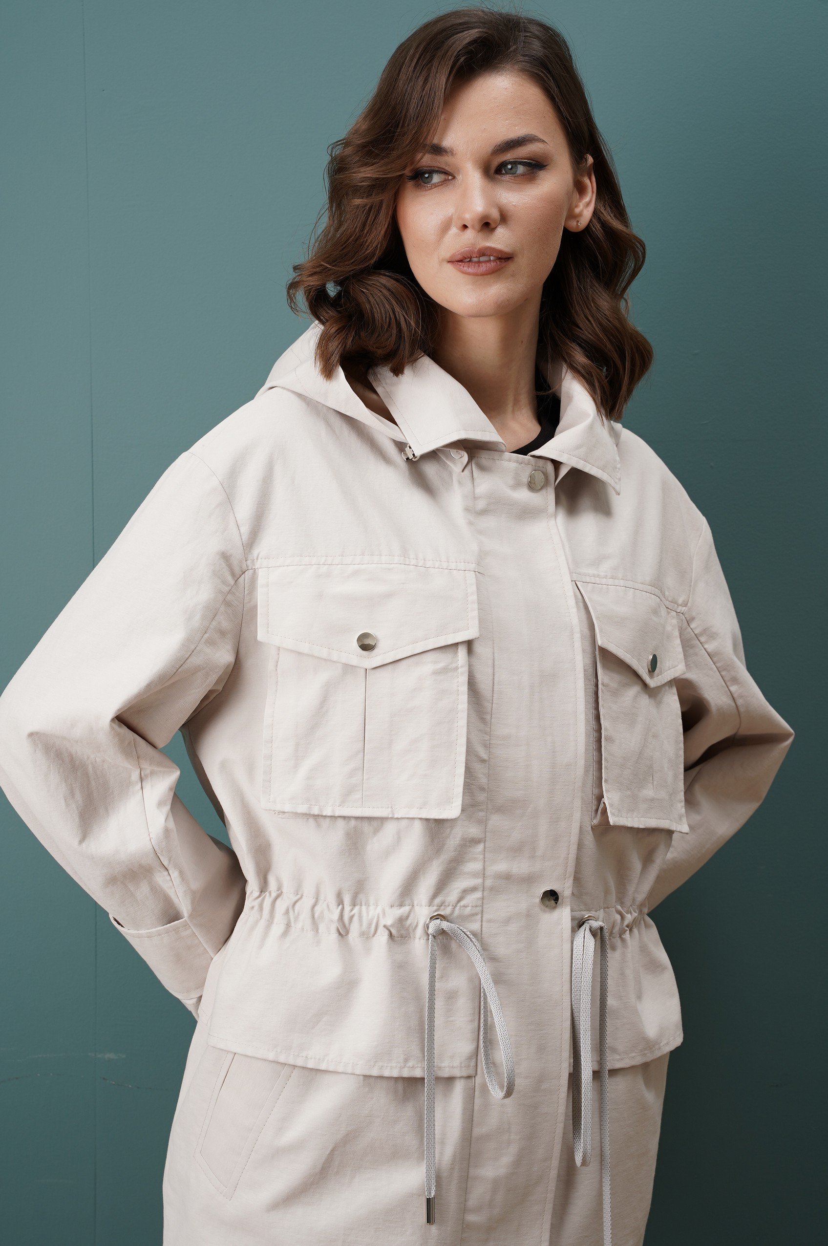 В качестве куртки на каждый день , пожалуй не придумано еще более удачного варианта , нежели классическая парка. Сегодня в тренде модели классического бежевого цвета и длины до середины бедра. Силуэт свободный упрямленный, покрой рубашечный , застежка центральная на тесьму-молнию и отделочную планку, воротник стояче-отложной, капюшон сьемный. Полочка с отрезной кокеткой, отлетной средней частью, переходящей в баску, нагрудным накладным карманом-пеналом с клапаном, и нижним прорезным карманом с листочкой. Спинка с отрезной кокеткой, отлетной средней частью. Рукав с передним и и локтевым швами и отделочной патой на контактной ленте. По линии талии - кулиса, регулирующая прилегание изделия, с отделочным шнуром. Длина рукава с плечом около 73 см. Длина изделия около 76 см.