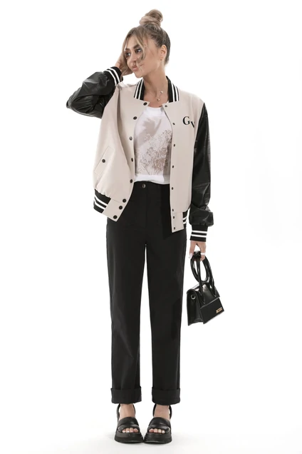 Цветовая гамма для верха, подкладки, фурнитуры, отделки: куртка из эластичной ткани в одной цветовой гамме. Рукава из кожзама, контрастного основной ткани. Манжеты и стойка из трикотажного полотна- резинка.