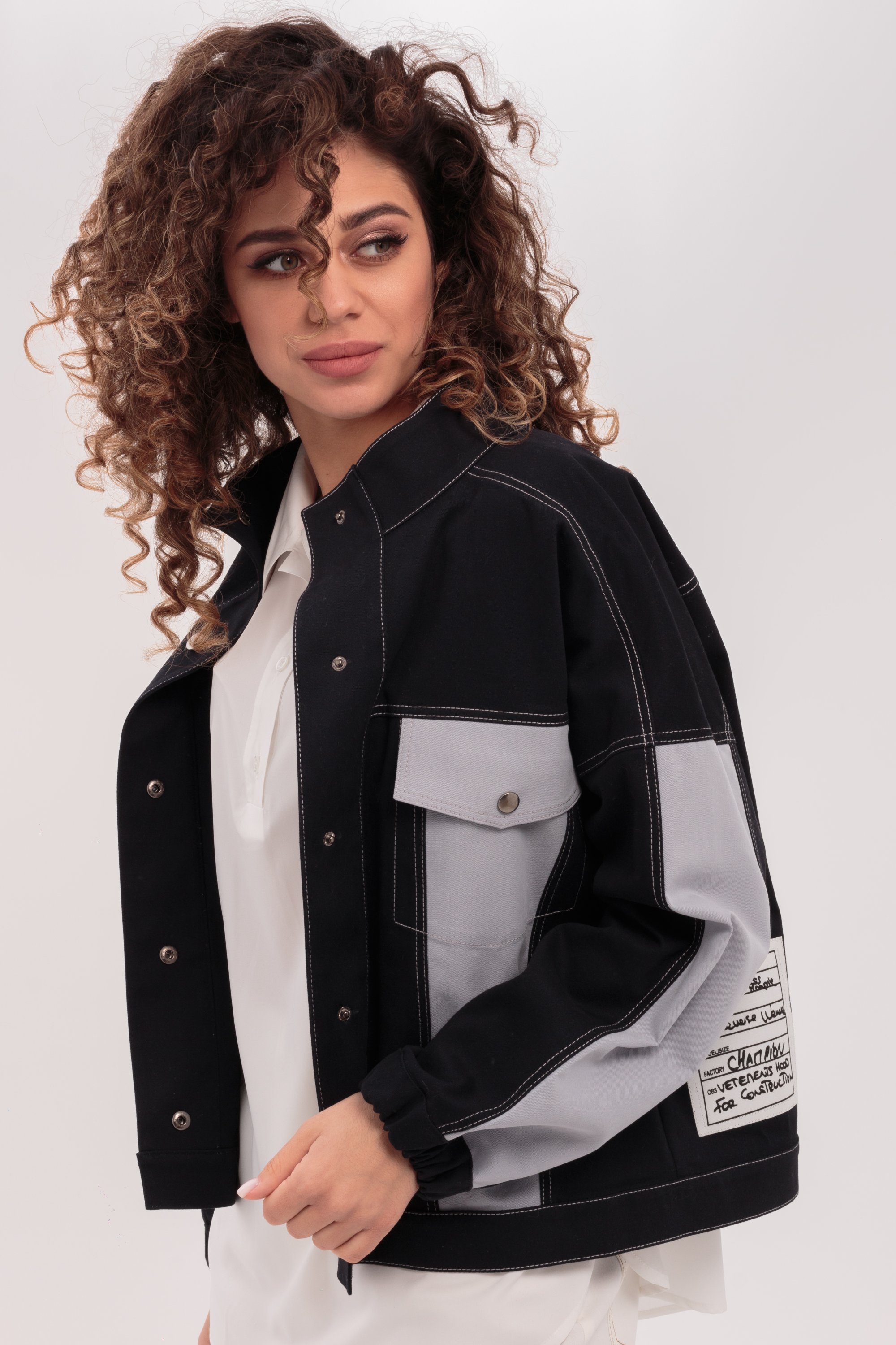 Куртка прямого силуэта со вставками. Детали переда: воротник стойка шириной 6 см, планка с застежкой на кнопки шириной 6 см, плечевой шов смещен на перед на 3 см. По переду выполнено членение, карманы с клапаном и настрочкой. Клапан кармана 14х5 см с кнопкой. Карман глубиной 15 см. Рукав объемный, со вставкой по верхней части, манжета по рукаву - 4 см шириной. По спинке также выполнено членение с контрастной вставкой.