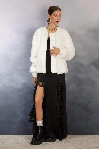 Стильная укороченная шубка из мягкого искусственного меха. Шубка длиной до середины бедер. Изделие на молнии. Карманы прорезные с листочками. Спущенная линия плеча, объемный рукав, низ рукава на плотной манжете (довяз). Спинка прямая. Низ изделия на резинке. Горловина круглая с довязом. Шубка на авторской хлопковой подкладке.