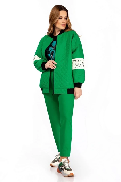 Куртка женская, на подкладке, свободного силуэта, с центральной сквозной застежкой на тесьму-молнию, с втачной стойкой из отделочной ткани. Детали переда куртки с кокетками, в боковых швах обработаны карманы с широкими листочками с втачными концами. Деталь спинки куртки с кокетками. Рукава втачные одношовные с притачными манжетами из отделочной ткани. Рукава с 2-мя горизонтальными подрезами, на центральных частях расположена аппликация-вышивка. Понизу куртки по боковым расположены втачные планки из отделочной ткани. Длина спинки – 70см. Длина рукава (с манжетой, до шва втачивания стойки) - 72см, ширина рукава – 22см.