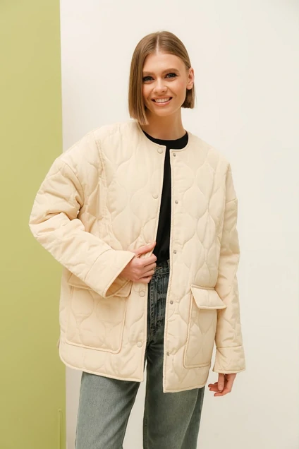 Куртка стеганая, на утеплителе, свободного силуэта, с карманами спереди. Длина 74 см, рукав 64 см.