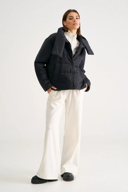 Куртка стеганная, свободного силуэта, со спущенной линией плеча. Выполнена из курточной ткани с бархатистым эффектом, внутри на мембране, водоотталкивающая и не продуваемая. По полочкам карманы с листочкой. Застежка центральная на кнопки. Воротник - стойка, с запахом с застежкой на магнитные кнопки.