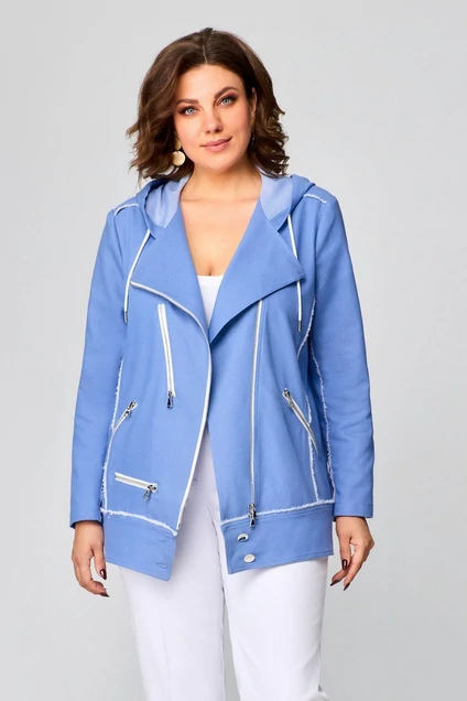 Куртка женская из джинсовой ткани прямого силуэта, слегка зауженная к низу. Застежка ассиметричная на молнию с лацканами. Горловина с капюшоном на кулисе. По переду два прорезных кармана на молнии и две декоративные молнии. Боковая деталь переходит в рельефы по переду и спинке. По низу куртки притачной пояс с застежкой на две петли и пуговицы. По спинке кокетка. Рукав втачной длинный, двухшовный с застежкой молнией по низу. Нижние срезы кокетки, срезы рельефов, пояса и пагонов с бахромой. Куртка без подкладки.