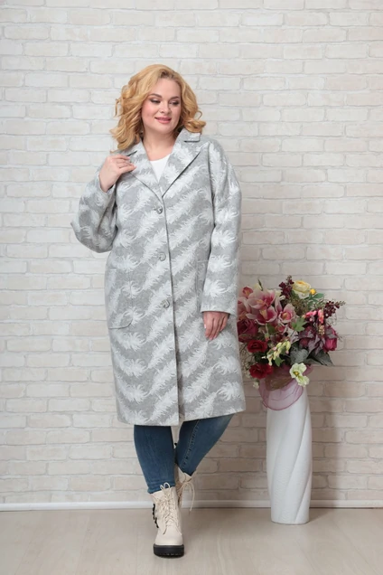 Пальто женское прямого силуэта , однобортное, со спущенным рукавом, застегивается на петли пуговицы, на подкладке, с плечевыми накладками. Пальто выполнено из пальтовой ткани серого цвета с дизайном перья выполнены на машинной вышивке молочной ниткой. По бокам действующие карманы. Длина изделия по спинке 101 см, длина рукава от плеча 78 см. Фото ткани прилагается