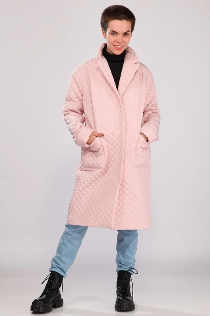 Демисезонное пальто свободного кроя с отложным воротником, на кнопках. По переду накладные карманы и нагрудные вытачки. По спинке средний шов. Рукав втачной длинный одношовный прямой, со спущенным плечевым срезом, по низу - с отложной манжетой, длина рукава легко регулируется с помощью отворота. В комплект входит съемный пояс из основной ткани. Длина по спинке: 102 см