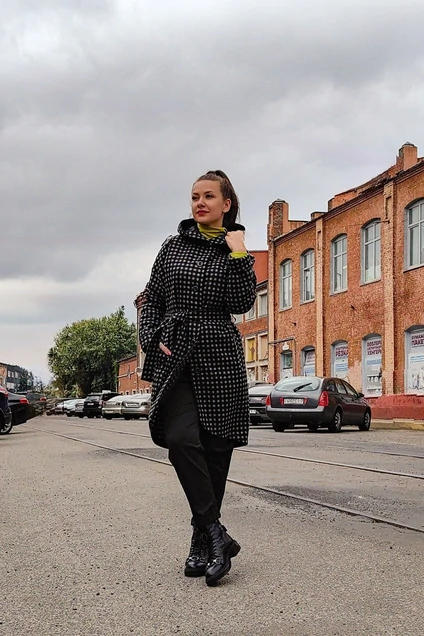 Полупальто женское силуэта «овал» из пальтовой ткани с капюшоном длиной до линии колена, со спущенной линией плеча, втачным покроем рукава, фигурной линией низа и навесным поясом. Полупальто на подкладке с утеплителем. Изделие с застёжкой на 6 прорезных петель и пуговиц. На деталях переда обработаны прорезные карманы листочкой. В среднем шве спинки обработан «V»-образный разрез. Рукав втачной одношовный с цельновыкроенной манжетой на отворот. Вдоль бовых швов на уровне талии – шлёвки из эко-кожи.