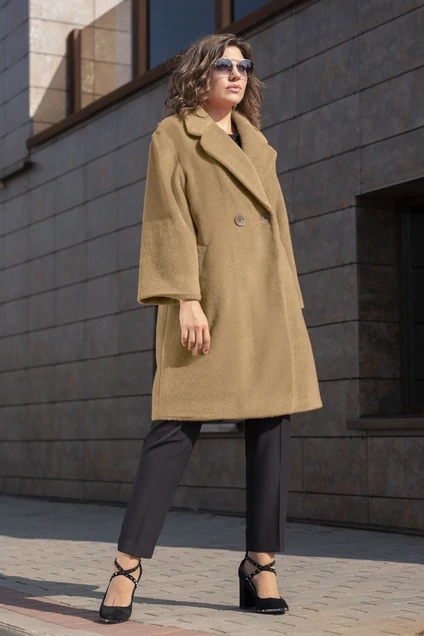 Пальто свободного кроя из полушерстяной ткани. На переде удобные карманы, застежка на пуговицы. Рукав 7/8. Изделие на подкладе. Длина пальто 94 см, рукава 49 см.
