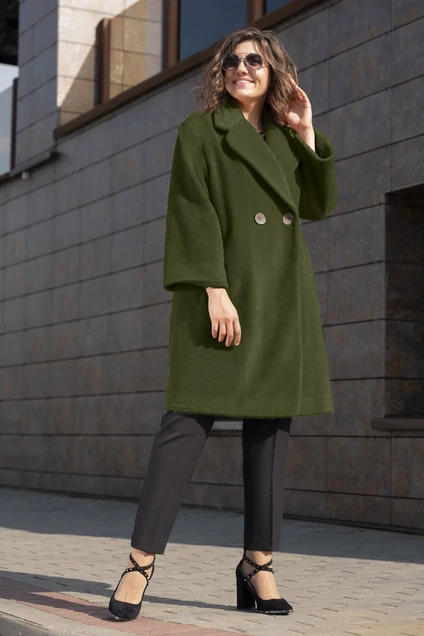Пальто свободного кроя из полушерстяной ткани. На переде удобные карманы, застежка на пуговицы. Рукав 7/8. Изделие на подкладе. Длина пальто 94 см, рукава 49 см.