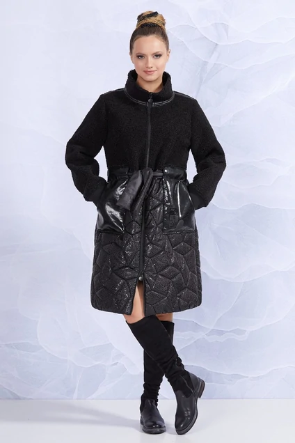 Оригинальное пальто полуприлегающего силуэта сочетает в себе комбинацию из экомеха и стежку из водоотталкивающей ткани с эффектным принтом. Застежка на молнию, спереди накладеные карманы, воротник - стойка, рукава с трикотажными манжетами. Степень приталивания ругулируется поясом.