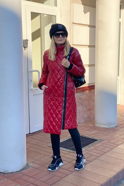 Пальто женское из стеганой плащевой ткани с синтепоном. Пальто и рукав 120мг/м2. Рекомендуем надевать при температуре +7-3. Прямого силуэта ,с втачным рукавом на спущенной пройме,воротник-стойка,застежка на молнию ассиметрично по переду ,вдоль молнии -отделочная тесьма ,низ рукава с довязом ,внутренние детали стойки и подборт изделия из однотонного черного лака без стежки ,по переду в рельефах -карманы с листочкой на кнопках ,низ изделия с выступами спереди и сзади по модели.Изделие на подкладке.