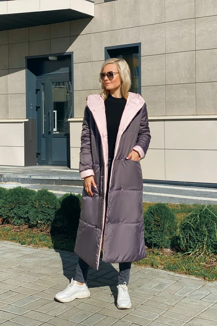 Пальто женское из тонком плащевой ткани на ткани на утеплителе нового поколения isosoft (Пальто 300 г/м2 ,Рукав 200 г/м2).Используют при температуре -10 и до -25 градусов. 2-стороннее, 2-цветное, с втачным рукавом с отложной манжетой по низу рукава, прямого покроя, удлиненное, по переду –карманы горизонтальные в швах, изделие 2-бортное на кнопках с капюшоном.