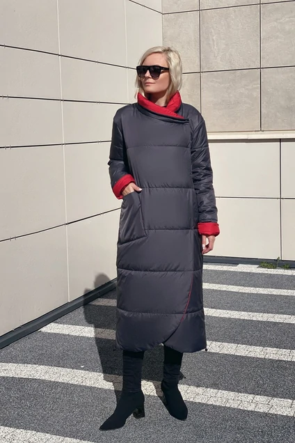 Пальто женское стеганное из плащевой ткани на утеплителе нового поколения isosoft (Пальто 250г/м2, рукав 200 г/м2)Рекомендуем надевать при температуре -10 и до -25 градусов. 2-бортное с застежкой на кнопки, с втачным рукавом на спущенной пройме, прямое, по низу в боковых швах – вставлены молнии, разъемные от низа, изделие на подкладке, под пояс из той же ткани, воротник-стойка, по переду ассиметрично-накладной карман справа.