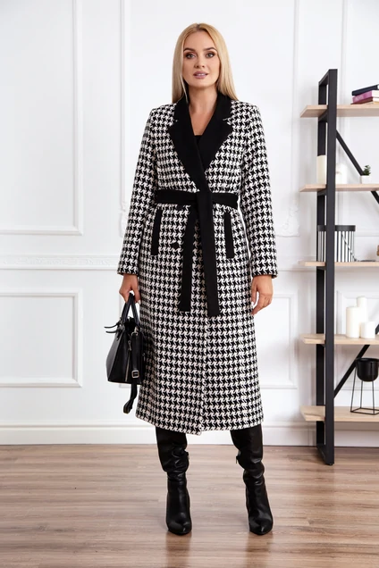 Пальто женское демисезонное без подкладочной ткани,из плотной поливискозной ткани в клетку с черной отделкой на воротнике ,карманах ,поясе. Полуприлегающего силуэта ,удлиненная ,под пояс. Рукав втачной, по переду-карманы вертикальные с листочкой. Изделие 2-бортное с застежкой на пуговицы на подкладке.