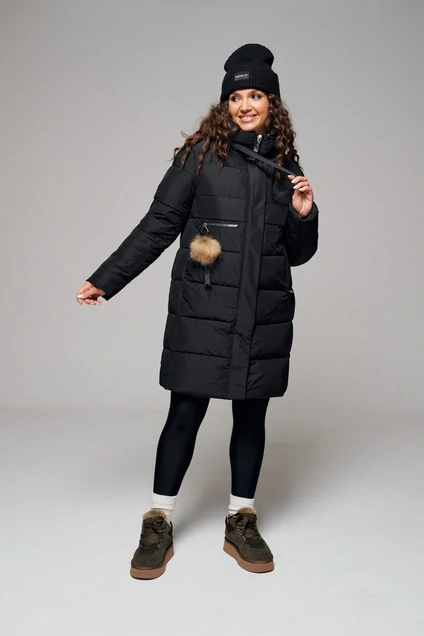 Стильное женское полупальто из гладкокрашеной полиэфирной ткани, на синтетической подкладке, с утепляющим наполнителем холлофайбер, уникального качества, который практически неощутим в весе и толщине, в два раза теплее обычных синтетических утеплителей, легко восстанавливает форму и не теряет ее, обладает эффектом термоса (сохраняет тепло тела). Рекомендованный температурный режим до -25 градусов. Полупальто прямого силуэта, базового классического кроя. Передняя часть изделия с горизонтальными подрезами на уровне проймы и двумя горизонтальными подрезными бочками, а также с двумя внутренними, функциональными карманами в боковых подрезах. Вход в карман фиксируется на внутренние кнопки. На правой стороне переда расположен дополнительный элемент в виде кармана-обманки с декоративной, меховой подвеской-бубоном. Застежка центральная, на разъемную тесьму «молния» с двумя бегунками и ветрозащитной планкой снаружи. Застежка-молния имеет длину от линии низа до верхнего края капюшона Спинка с двумя вертикальными рельефами. Рукав спущенный, длинный, двухшовный, втачной. Внутри рукава предусмотрена дополнительная вставка в виде трикотажной манжеты. Капюшон притачной по линии горловины. По периметру капюшона протянут плоский, репсовый шнур, с декоративными наконечниками.