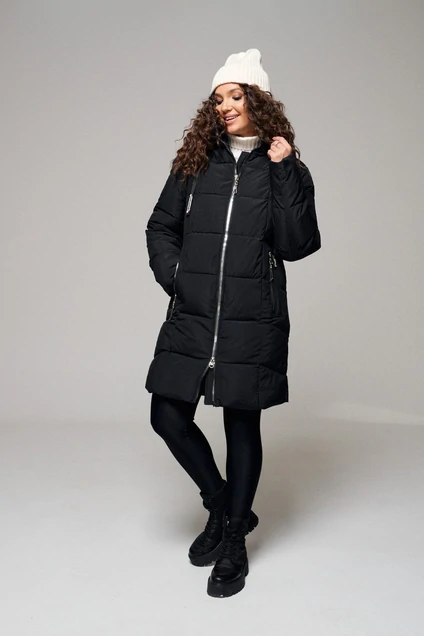 Стильное женское полупальто из гладкокрашеной полиэфирной ткани, на синтетической подкладке, с утепляющим наполнителем холлофайбер, уникального качества, который практически неощутим в весе и толщине, в два раза теплее обычных синтетических утеплителей, легко восстанавливает форму и не теряет ее, обладает эффектом термоса (сохраняет тепло тела). Рекомендованный температурный режим до -25 градусов. Полупальто прямого силуэта, базового классического кроя. Передняя часть изделия с вертикальными подрезами и боковыми функциональными карманами на металлических молниях. Застежка центральная, на разъемную тесьму «молния» с двумя бегунками и ветрозащитной планкой внутри. Застежка-молния имеет длину от линии низа до верхнего края капюшона. Спинка с двумя вертикальными рельефами.